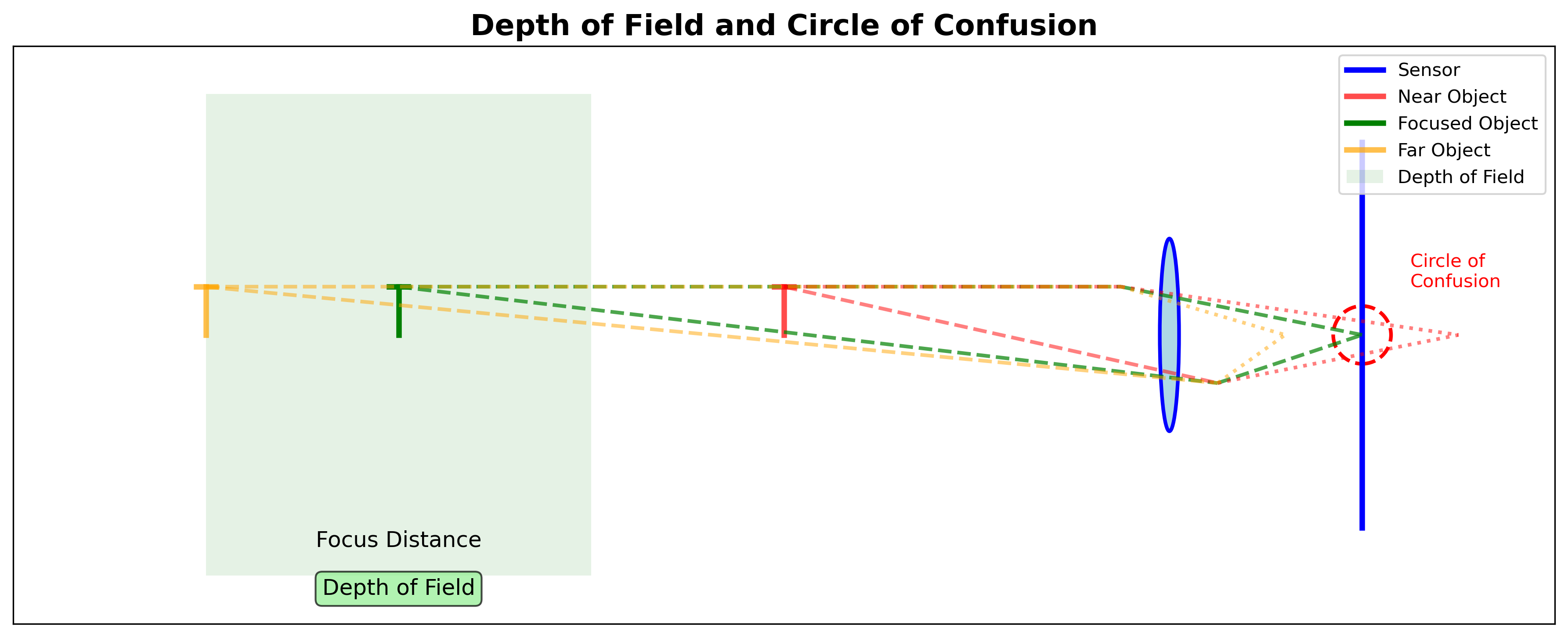 - 小光圈 → 深景深: 较大的距离范围都比较清晰