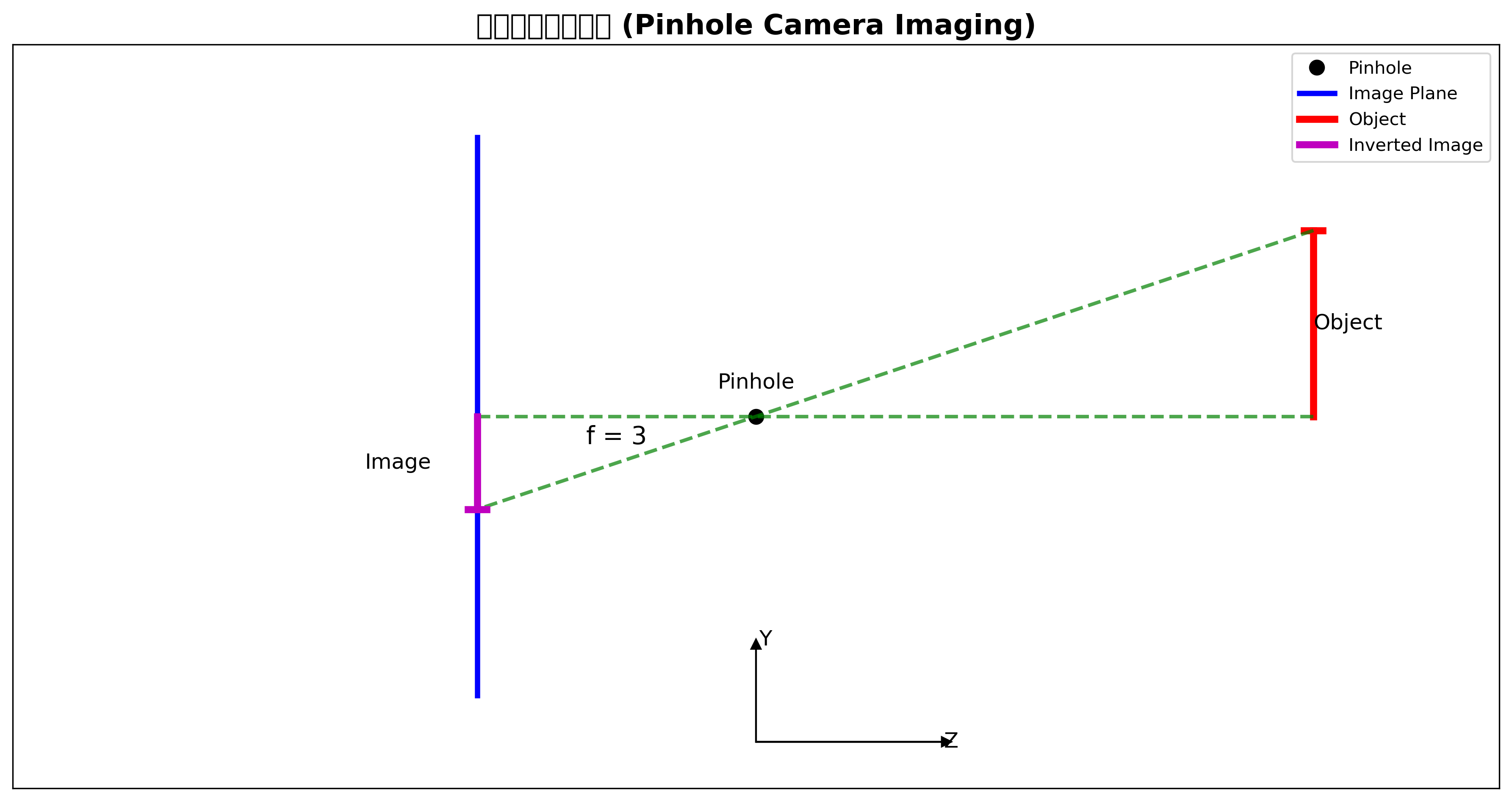 透视投影: \(\frac{x_s}{f} = \frac{x_c}{z_c}, \quad \frac{y_s}{f} = \frac{y_c}{z_c}\)