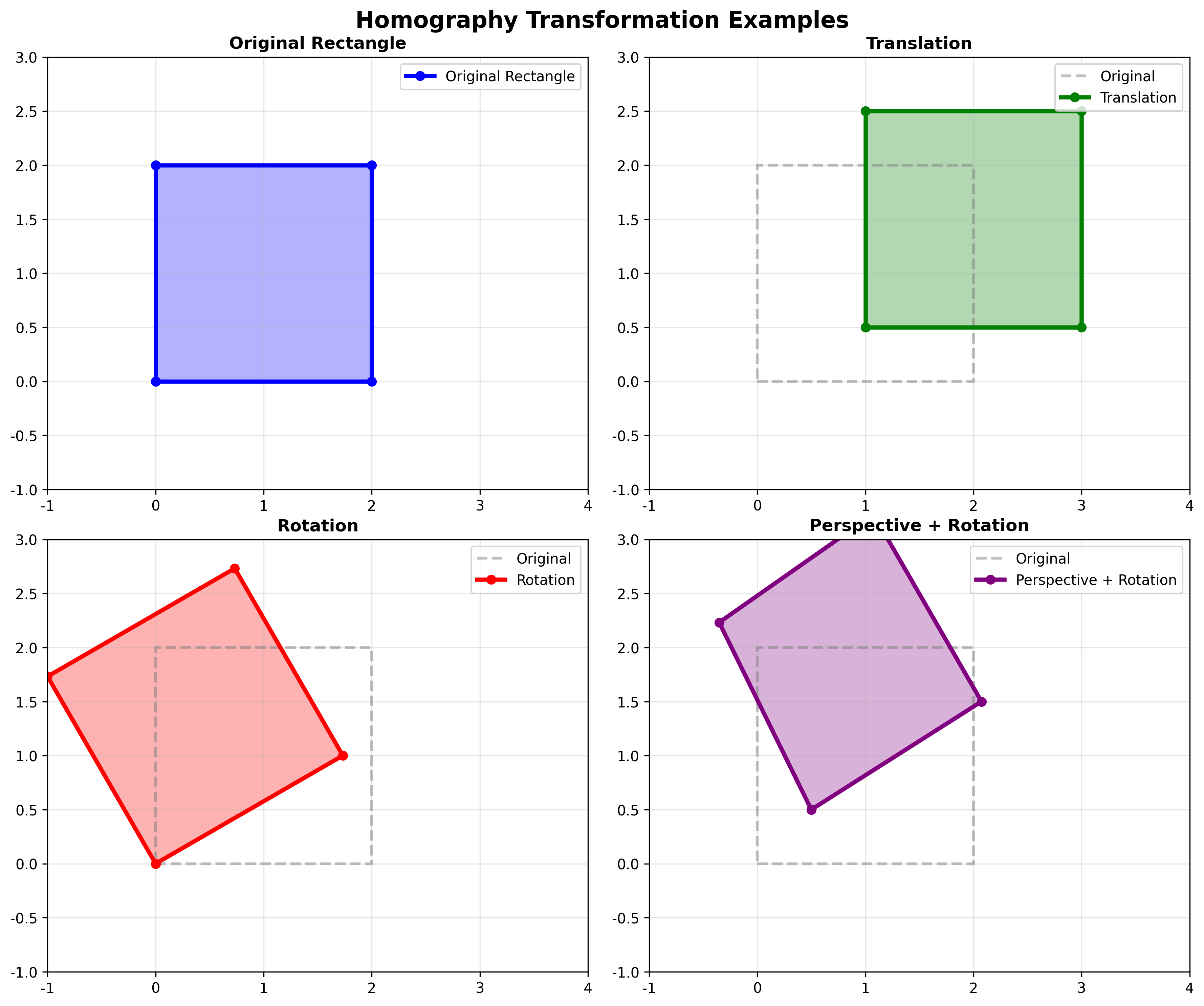 \[\begin{bmatrix} x' \\ y' \\ 1 \end{bmatrix} \cong \begin{bmatrix} h_{00} & h_{01} & h_{02} \\ h_{10} & h_{11} & h_{12} \\ h_{20} & h_{21} & h_{22} \end{bmatrix} \begin{bmatrix} x \\ y \\ 1 \end{bmatrix}\]特点: