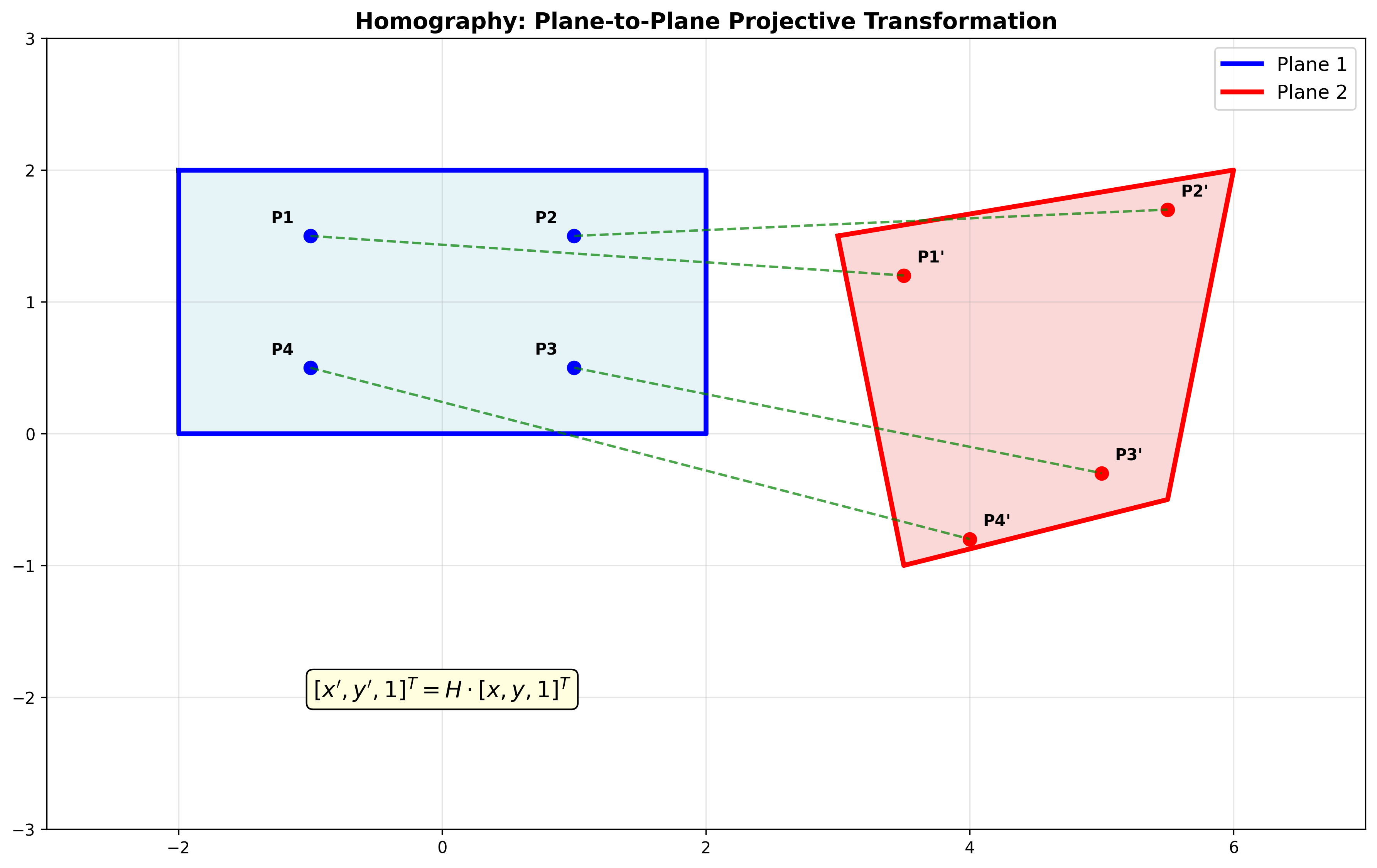 单应性变换: \(x_i' = \frac{h_{00}x_i + h_{01}y_i + h_{02}}{h_{20}x_i + h_{21}y_i + h_{22}}\) \(y_i' = \frac{h_{10}x_i + h_{11}y_i + h_{12}}{h_{20}x_i + h_{21}y_i + h_{22}}\)