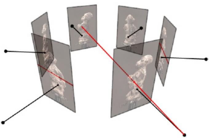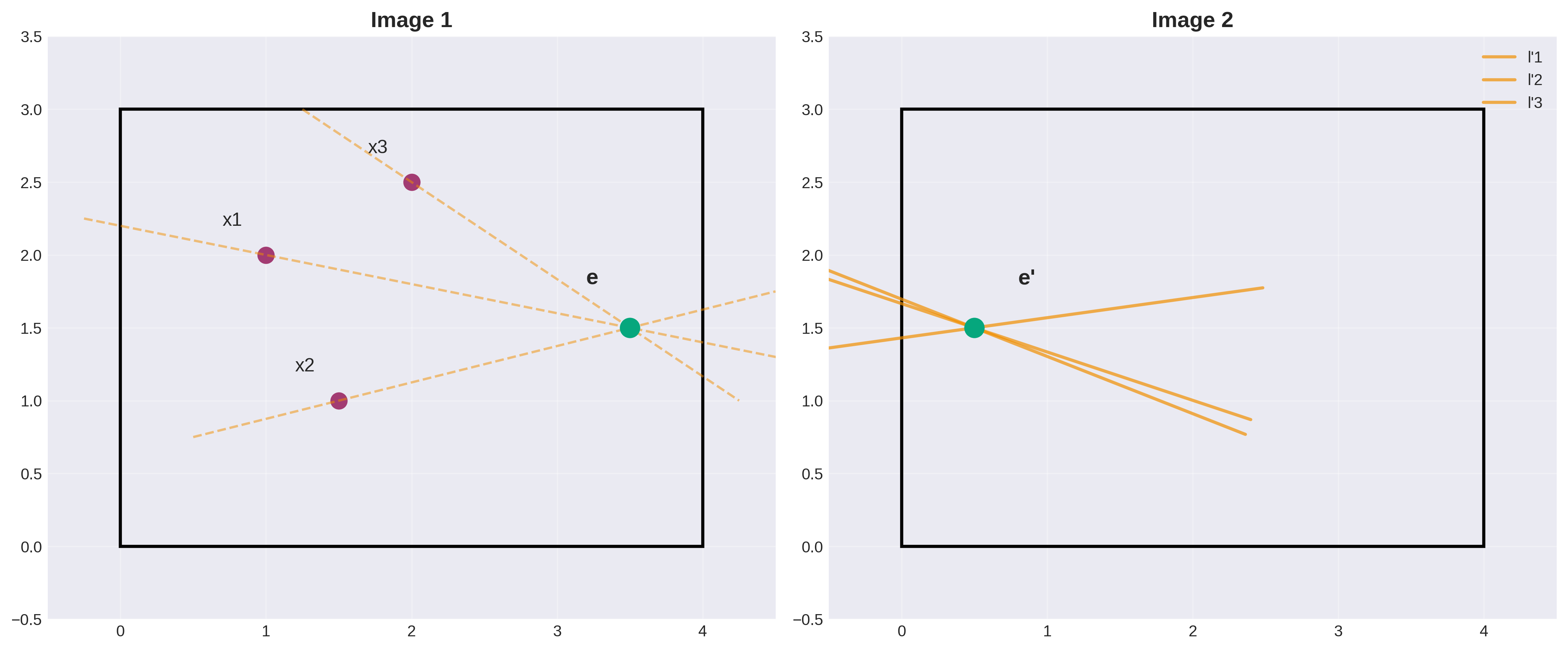给定图像1中的点 \(x\),其在图像2中的对应点 \(x'\) 必在对极线上: