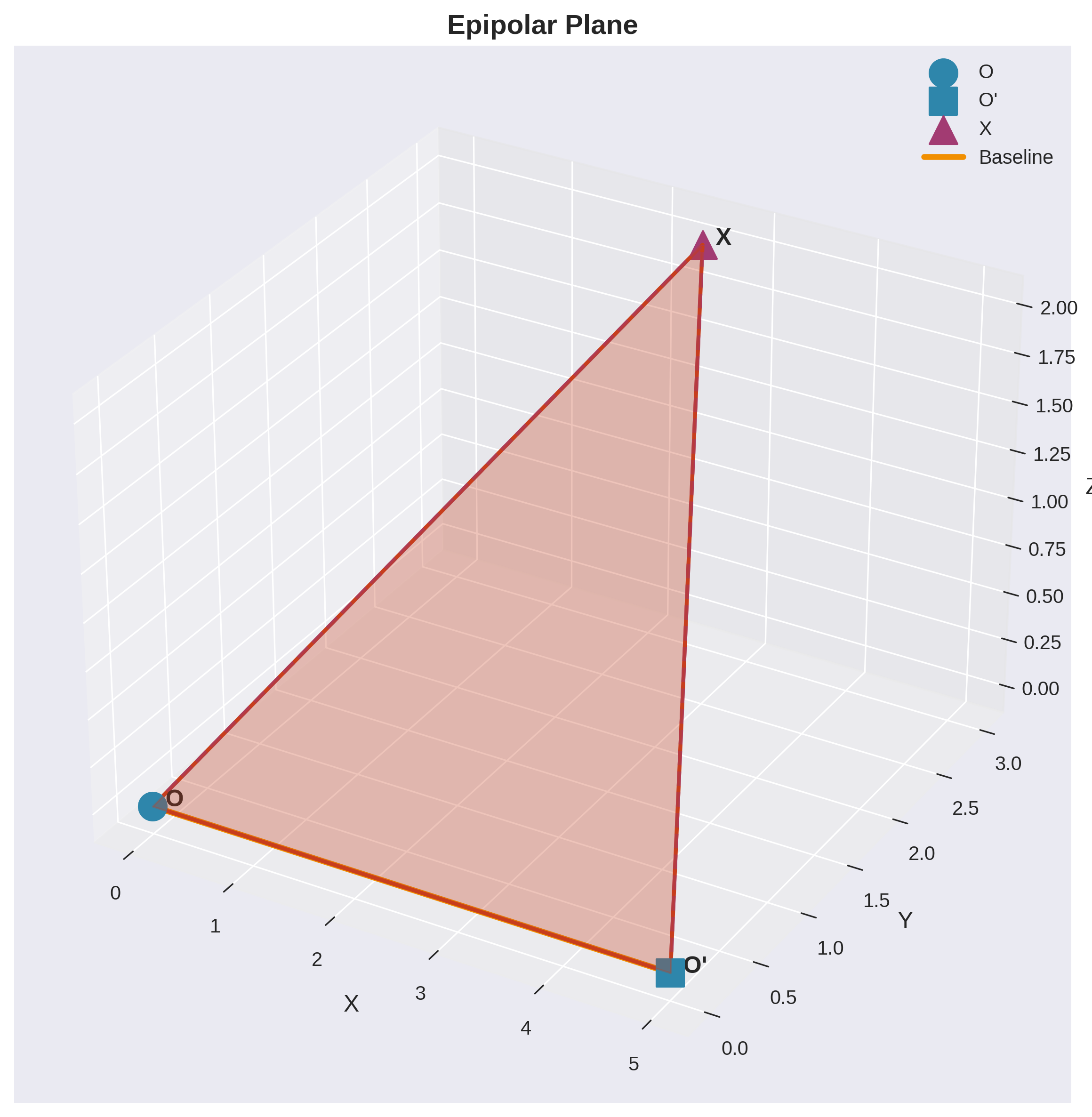 给定3D点 \(X\),由 \(X, O, O'\) 三点确定的平面称为对极平面: