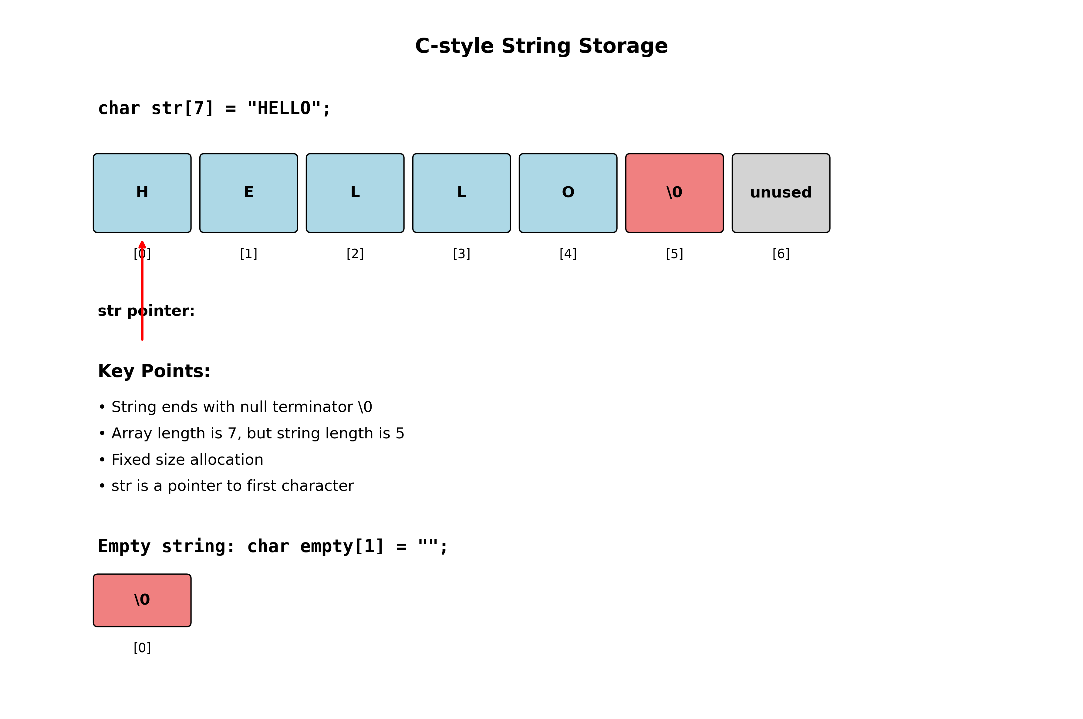 '\0'(ASCII码中8位BIT全0码,又称为NULL) - 长度为\(M\)的字符串实际最大容量为\((M-1)\)