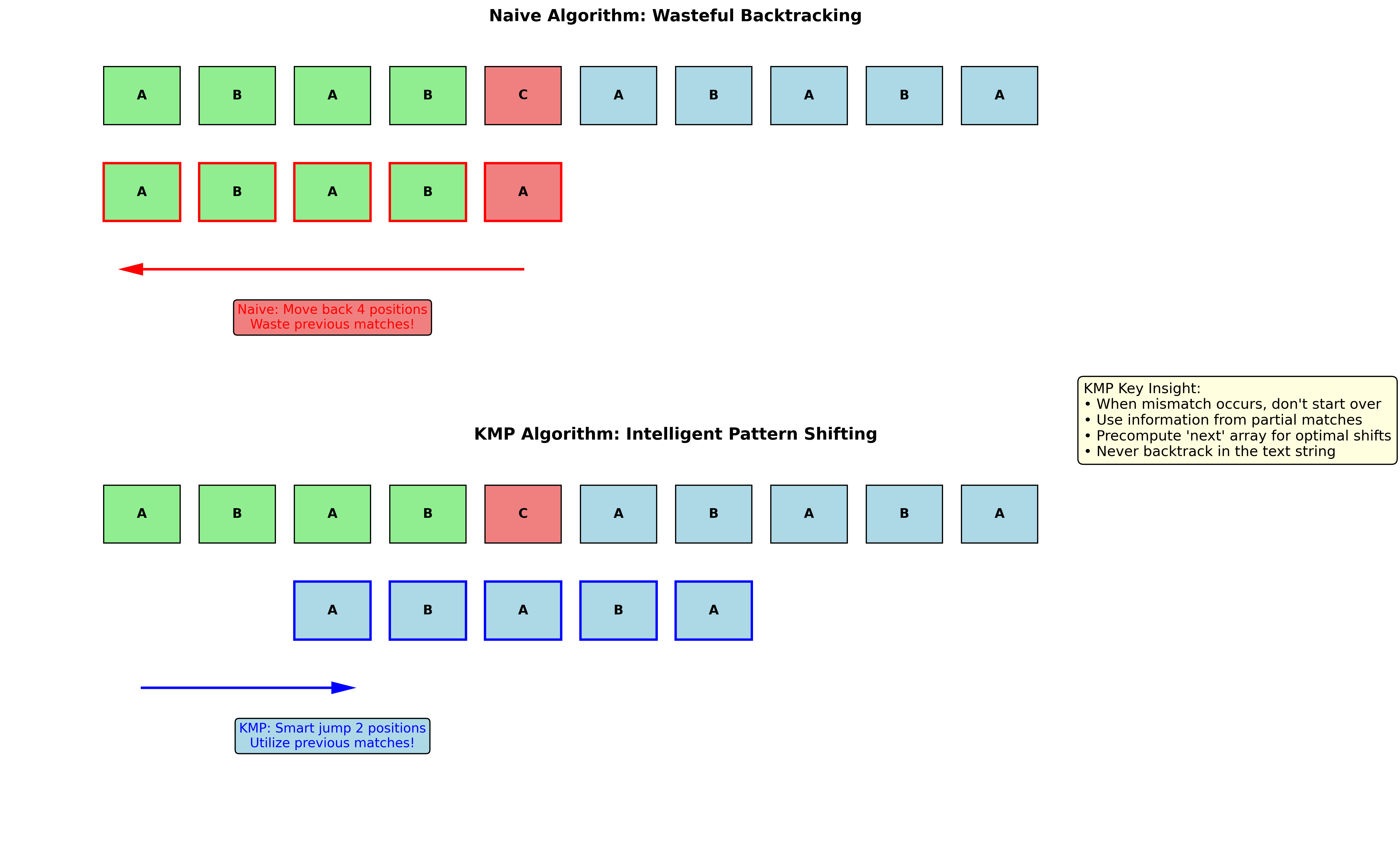 核心思想:如何利用匹配失败位置前的信息,消除大量不必要的回溯?