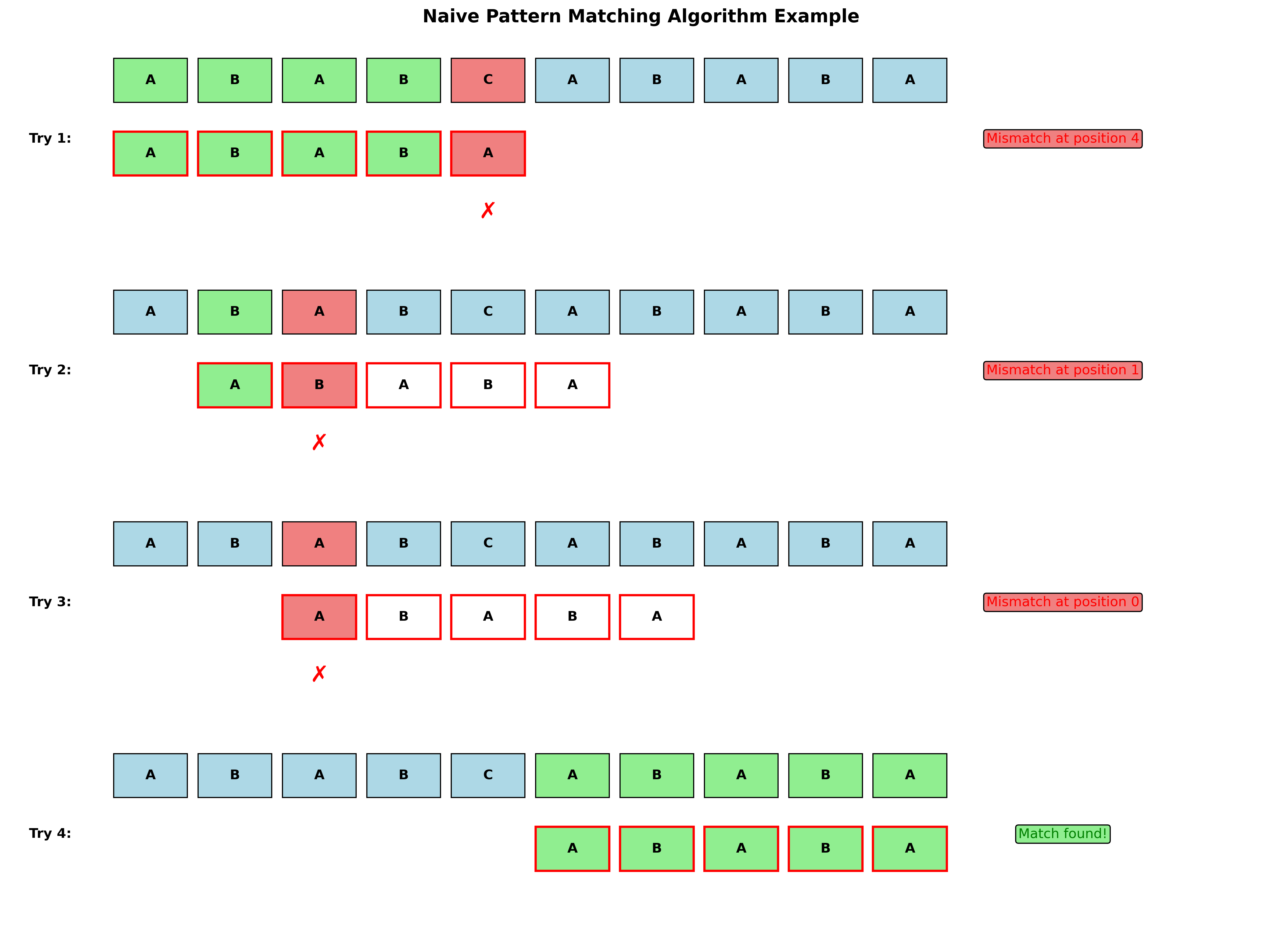 - 匹配失败:\((p_j \neq t_i)\)时,将\(P\)右移再行比较,尝试所有的可能情况