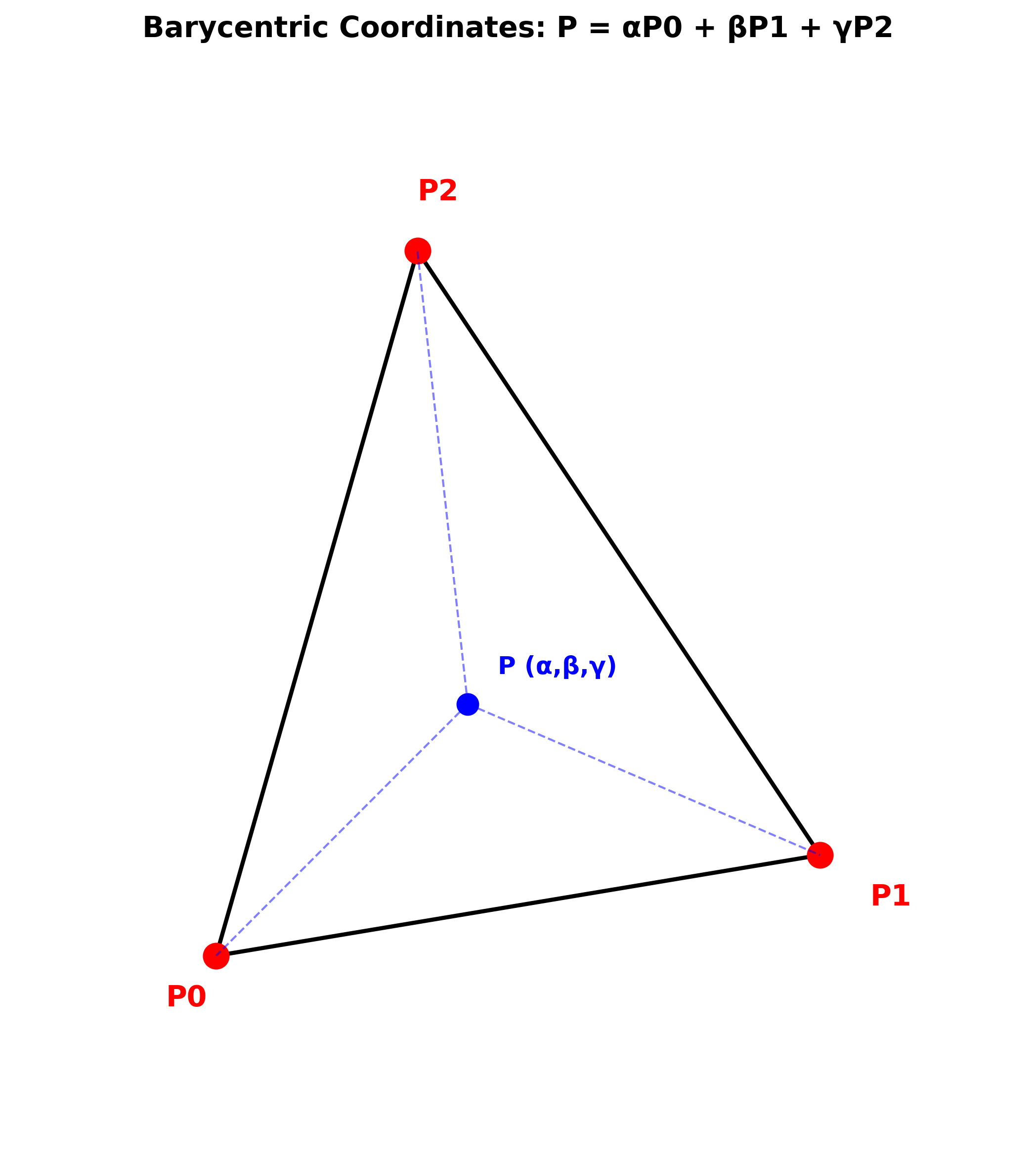 其中 \(\alpha + \beta + \gamma = 1\),\(\alpha, \beta, \gamma\) 是点 \(P\) 在三角形中的重心坐标。