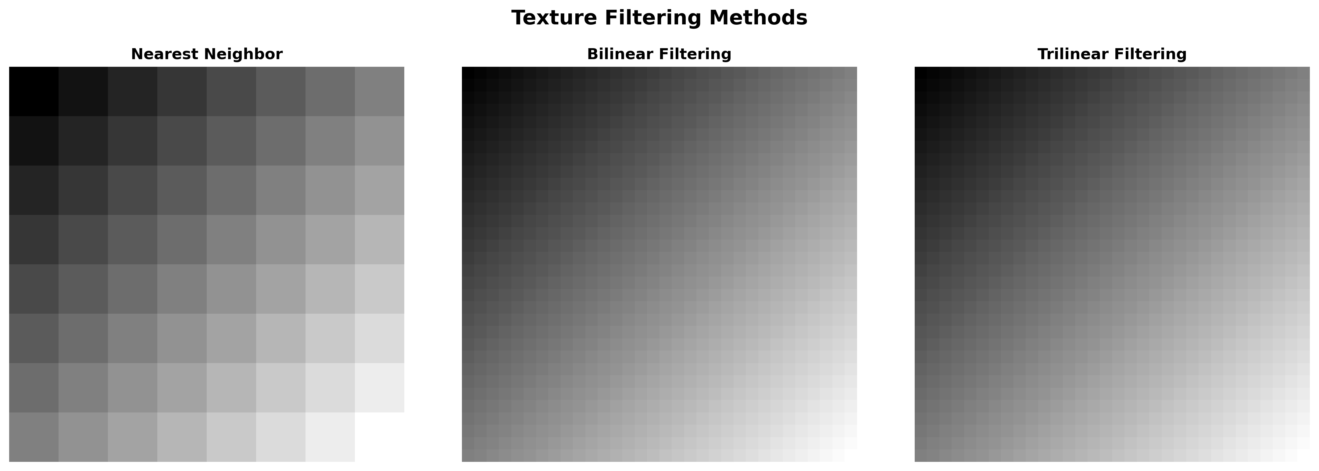 - 过滤与抗锯齿:使用双线性或三线性过滤平滑纹理