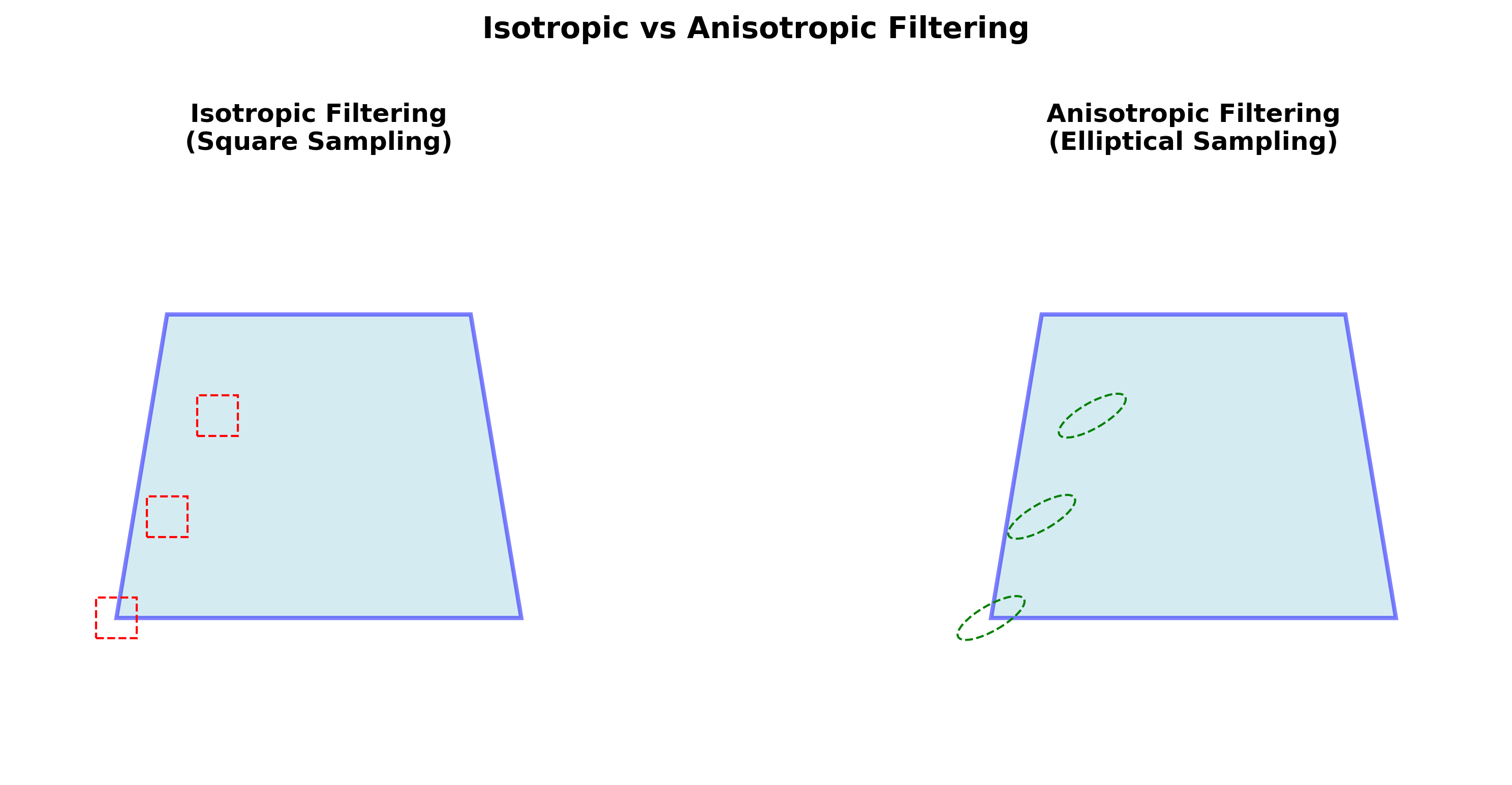 各向异性 (Anisotropic) 过滤 考虑纹理在不同方向的采样率差异,使用 椭圆形采样区域 而不是正方形: