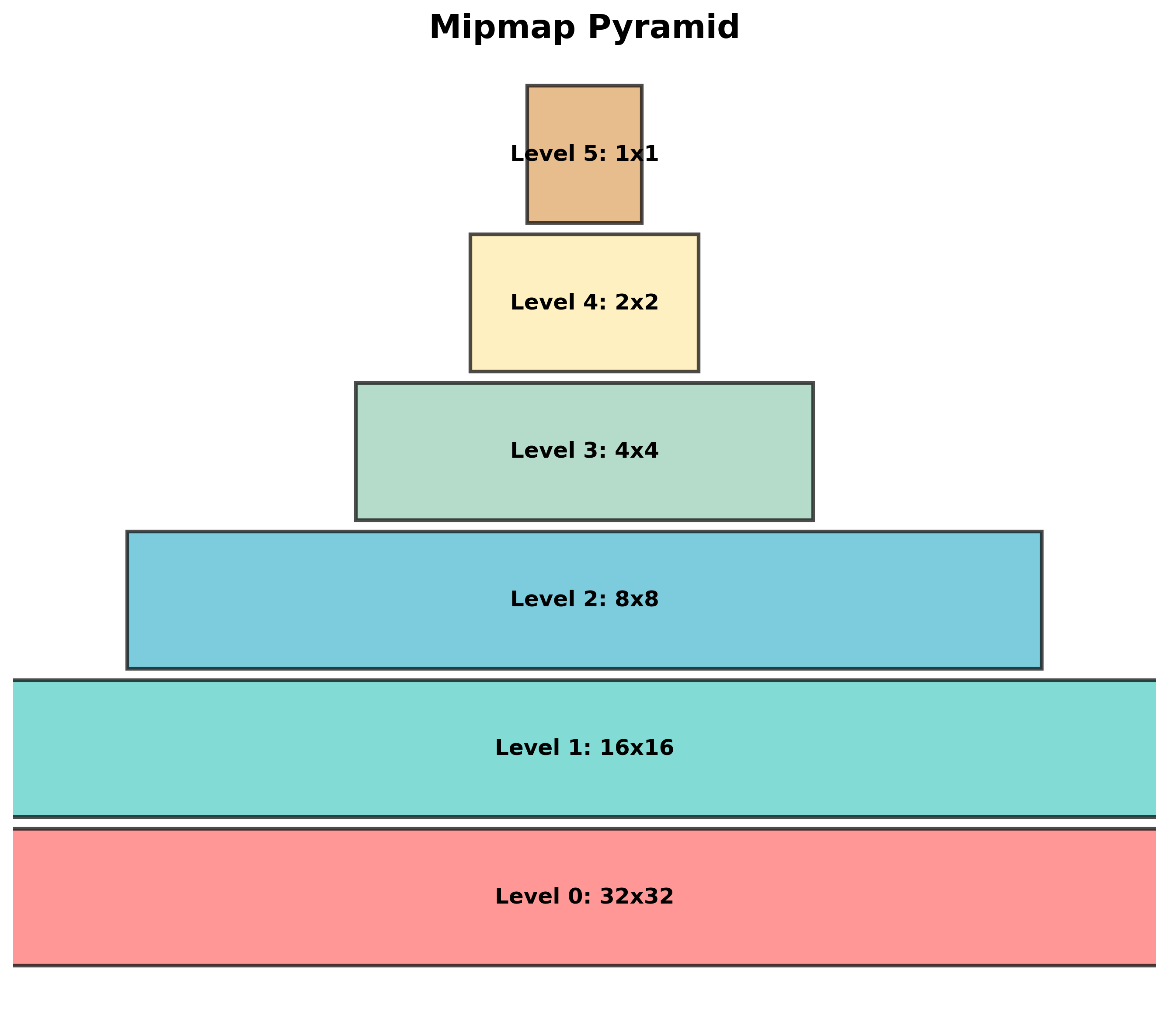 MIPMAP (Multum In Parvo = “much in a small place”) 是一种纹理优化技术,预先计算纹理的一系列逐级缩小版本: