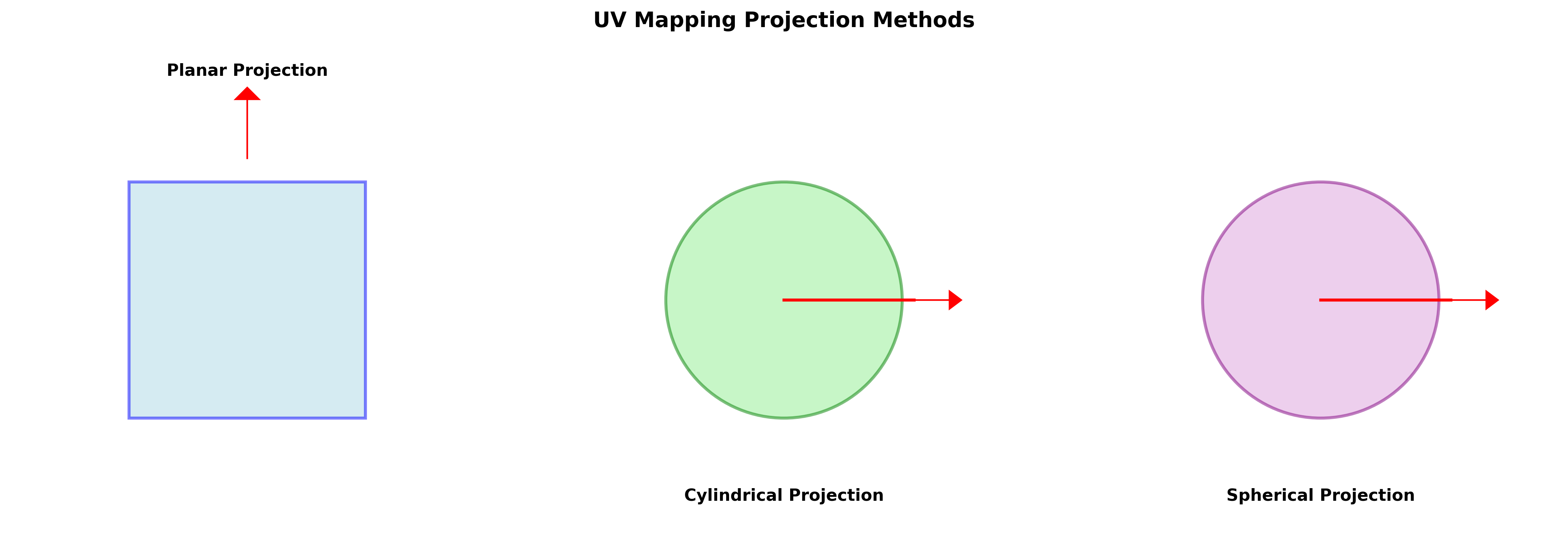 | UV 坐标 | 投影方程:平面、柱面、球面 | 建立 3D-2D 映射 |